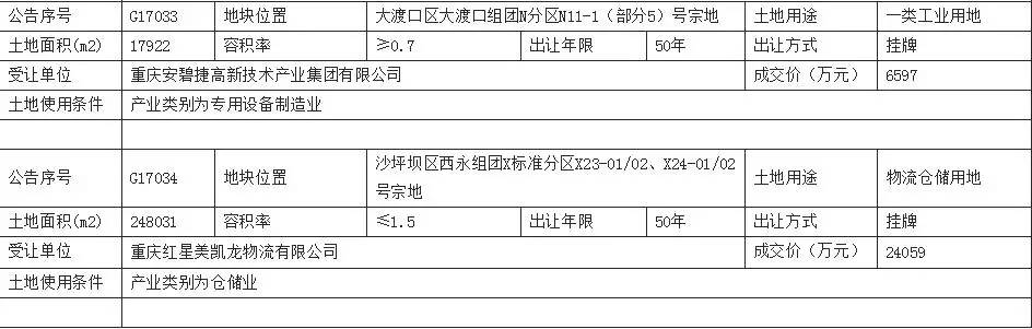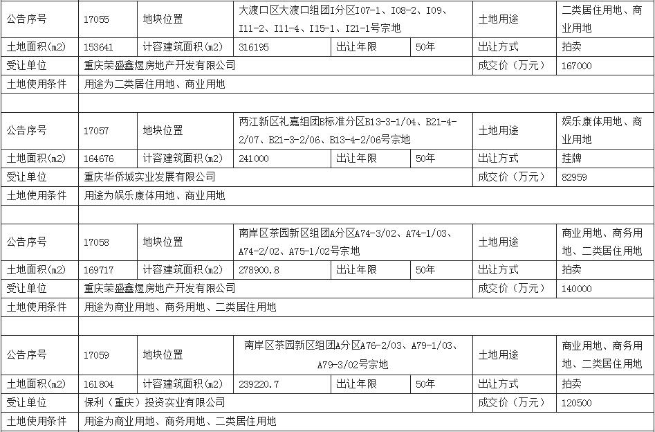 重庆市公共资源交易网公示:按照《土地管理法》、《城市房地产管理法》、《招标拍卖挂牌出让国有土地使用权规定》和《招标拍卖挂牌出让国有土地使用权规范》等有关法律法规,遵循公开、公正、公平的原则。我局于2017年6月8日出让9宗国有建设用地使用权。现将有关情况公示如下: