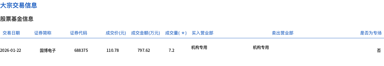 1月22日,国博电子大宗交易成交7.2万股,成交额797.62万元,占当日总成交额的0.74%,成交价110.78元,较市场收盘价125.18元折价11.5%。