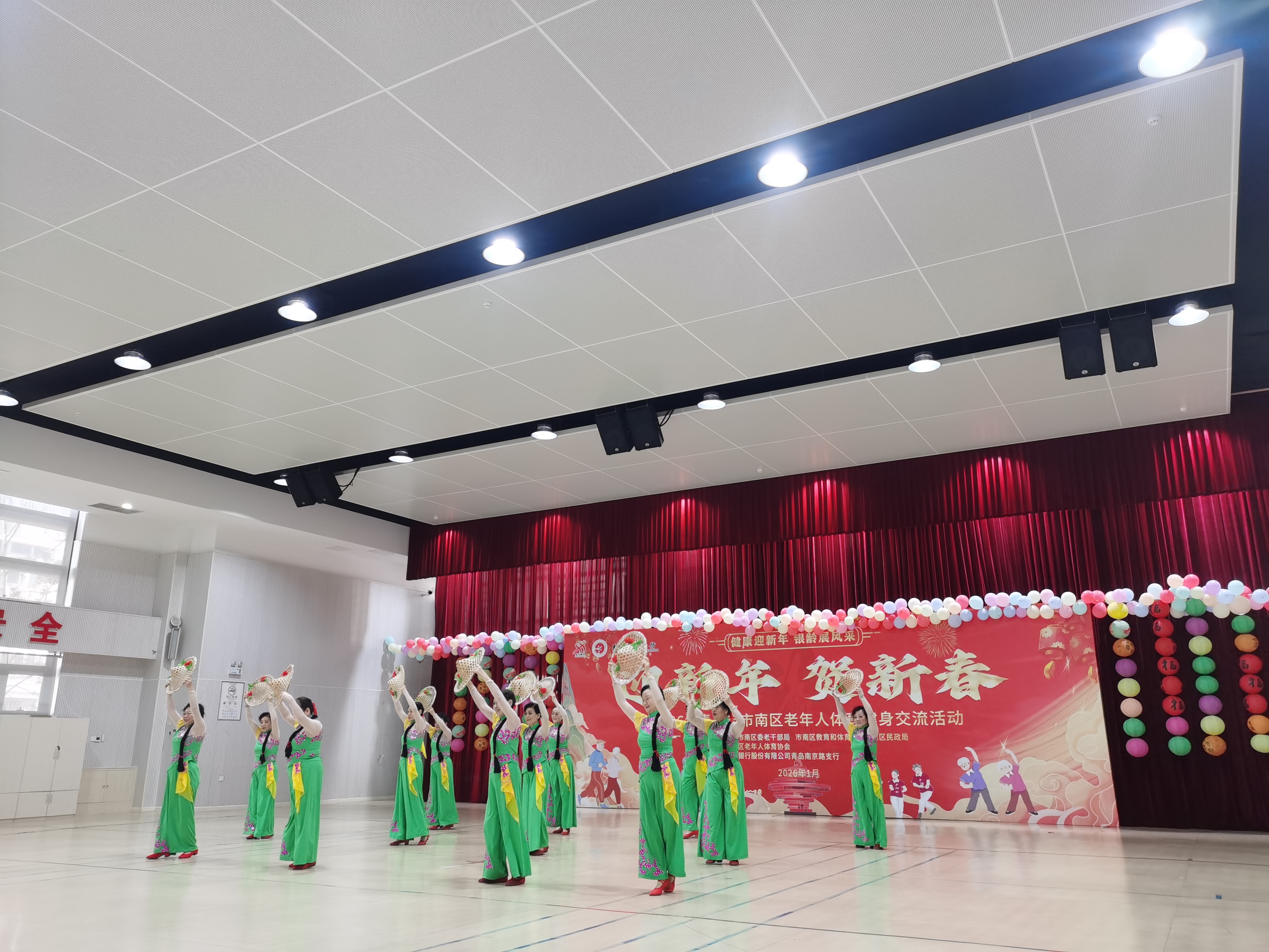 活动现场,来自市南区各街道及专项运动队伍的老年表演者们精神矍铄、意气风发,用精心编排的节目展现着新时代老年人的健康风采与生活热情。珠海路街道带来的手旗舞《强军战歌》,19 名表演者动作整齐划一、气势昂扬,鲜红的手旗在舞台上翻飞,尽显家国情怀;中山路街道的 25 位表演者联袂呈现男女声合唱《山丹丹花开红艳艳》,悠扬的歌声婉转嘹亮,唤起现场观众的共同记忆;湛山街道的羌族舞蹈《响铃声声》独具民族特色,24 名舞者身着特色服饰,伴着清脆铃声翩翩起舞,将羌族文化的独特魅力展现得淋漓尽致。