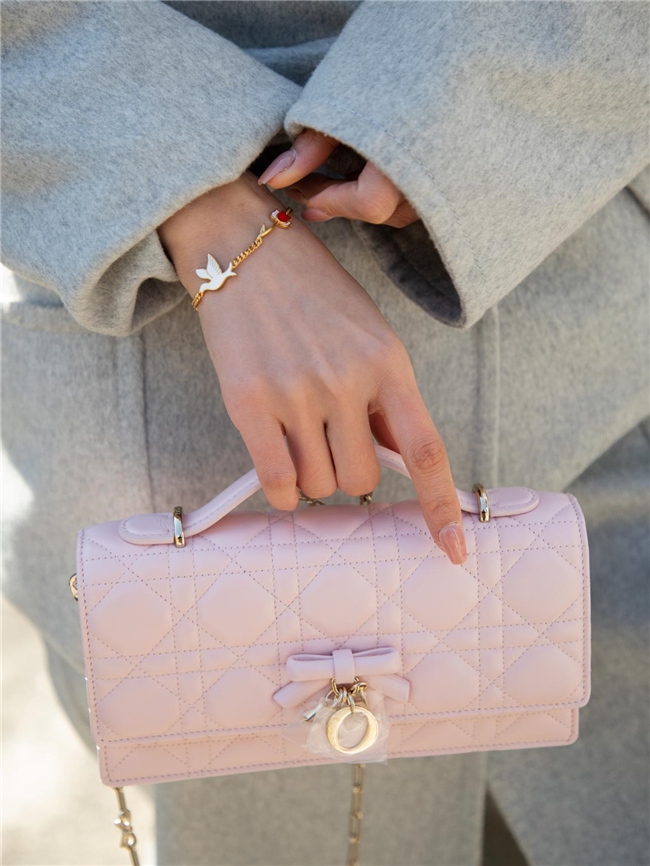 图注:My Dior迷你链条手袋,淡柔粉色搭配装饰性皮革蝴蝶结,极具少女心,珠饰链条增添精致感。