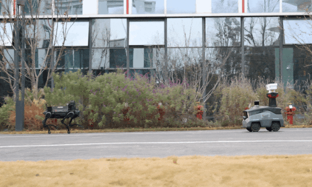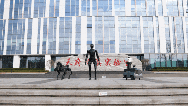 走进位于成都未来科技城的国际教育园区,可以看到人形机器人、四足机器狗与轮式无人车组成了一支强大的“联合巡检队”: