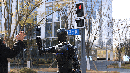 依托大量图像数据训练,该机器人已能准确识别常见物体,当检测到路口红绿灯,它如园区的行人一样正常等待,当科研人员迎面走来时,它自然地侧身避让,并抬起手臂挥手致意。