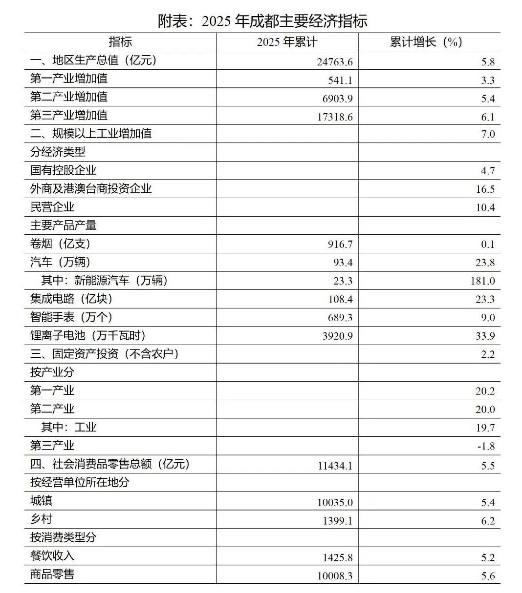 2025年成都经济运行情况公布,全市地区生产总值24763.6亿元,比上年增长5.8%,其中,社会消费品零售总额11434.1亿元,比上年增长5.5%,规模以上工业增加值比上年增长7.0%,服务业增加值比上年增长6.1%。