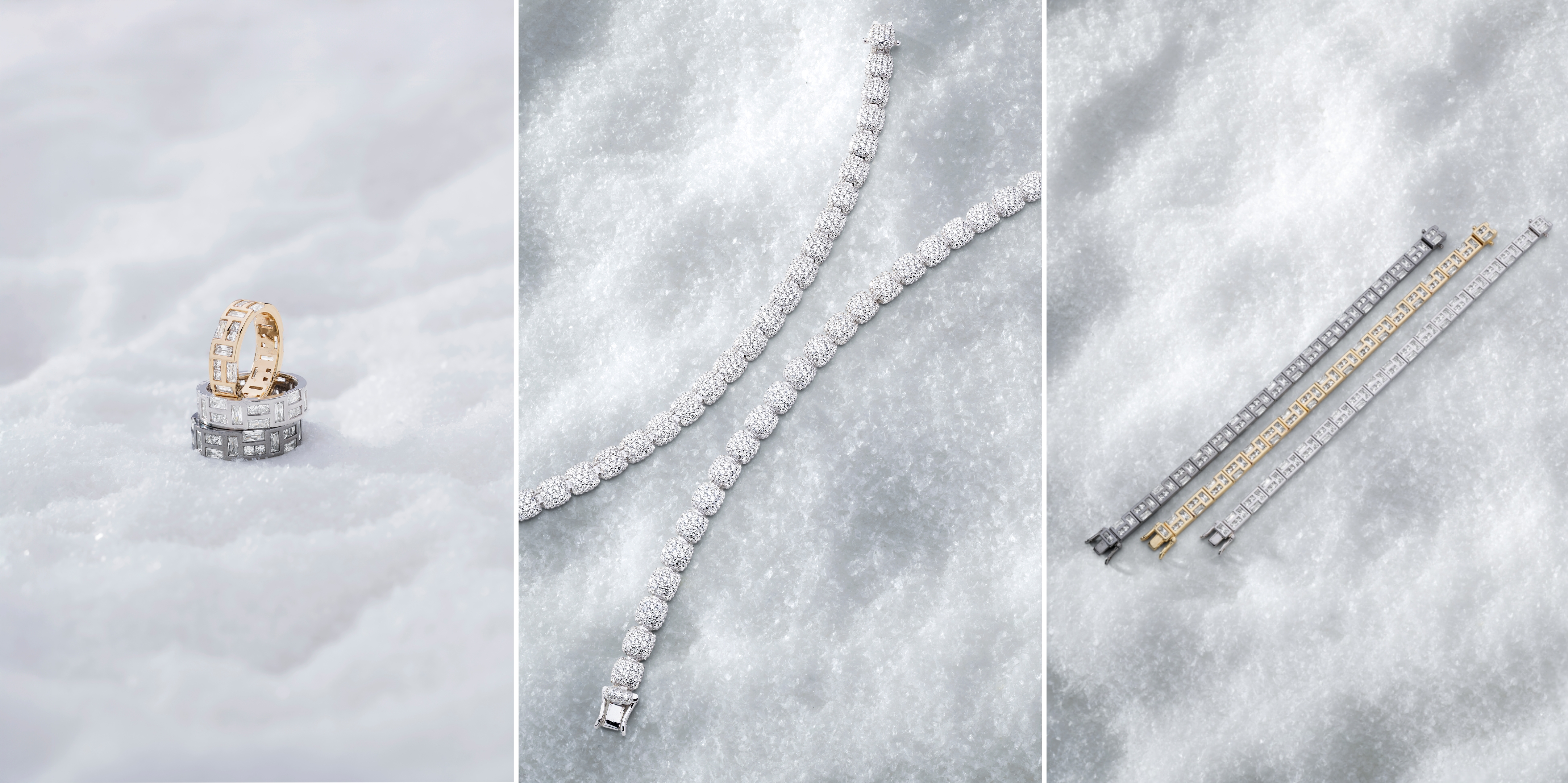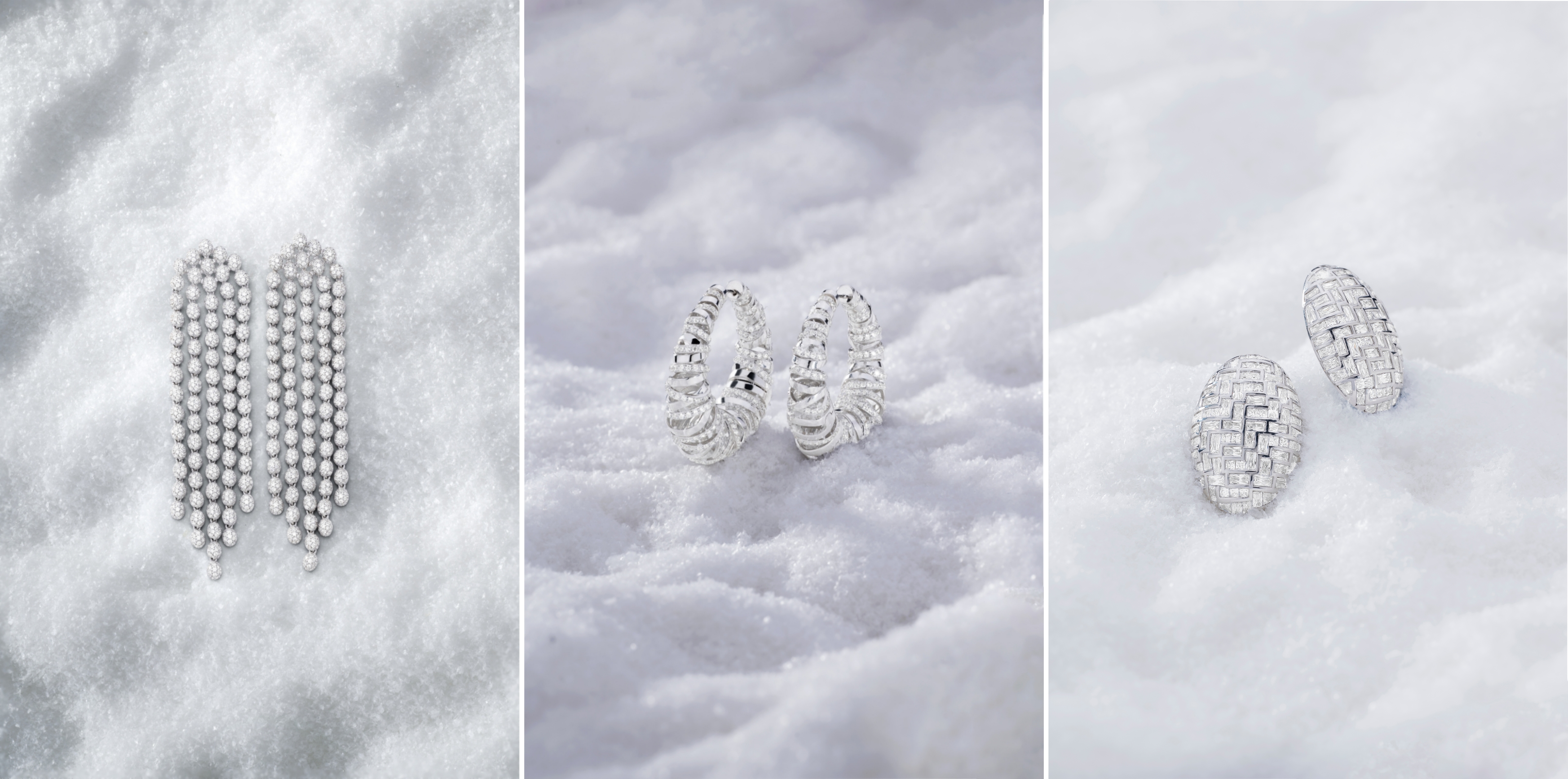 HIVER系列的创作灵感源于冬季自然景致的微妙变化与动人细节。设计师从浪漫纷飞的雪花,滑冰鞋在冰面上留下的轨迹,滑雪板在斜坡上划过的曲线,以及冰裂的几何纹理,这些冬日的“魔法”转化为品牌独特的设计语言。雪花不再只是六角形的重复,而是几何线条与现代审美重新演绎,既保留其自然形态的灵动,又赋予其时尚的简约精致;冰块的晶莹透亮则通过多层次镶嵌工艺与立体镂空结构得以再现,搭配冷色调与银白闪锆的巧妙结合,在光线折射下呈现出冬晨霜露般的清澈质感。这一系列的设计不仅是对冬季元素的提炼,更是对其内在精神的深度挖掘——寒冷中的坚韧、静谧中的生机,都与APM Monaco所倡导的"于平凡中发掘不凡"的品牌哲学不谋而合。