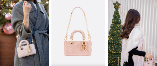 图为迪奥Lady D-Joy超迷你手袋,胭脂粉色羊皮革与浅金色金属吊饰相映成趣,适合约会等多种场合。