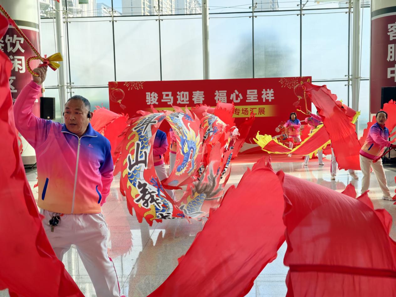 不仅仅是舞台,整个场馆都沉浸在沉浸式年味体验中:孩子举着刚吹好的糖画奔跑;老人静静观赏剪纸艺人手下绽放的红色窗花;扑鼻而来的是现场蒸制王哥庄大馒头的麦香、脂渣炸制的浓郁肉香、以及来自天南海北干果炒货的甜香……交织成最诱人的年节气息。