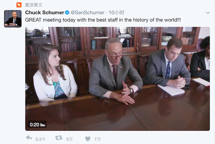 这场以始于赞美、终于感谢的内阁会议让特朗普在国会最重要的批评者、参议院民主党领袖舒默化身段子手,制作了一个视频讽刺他。