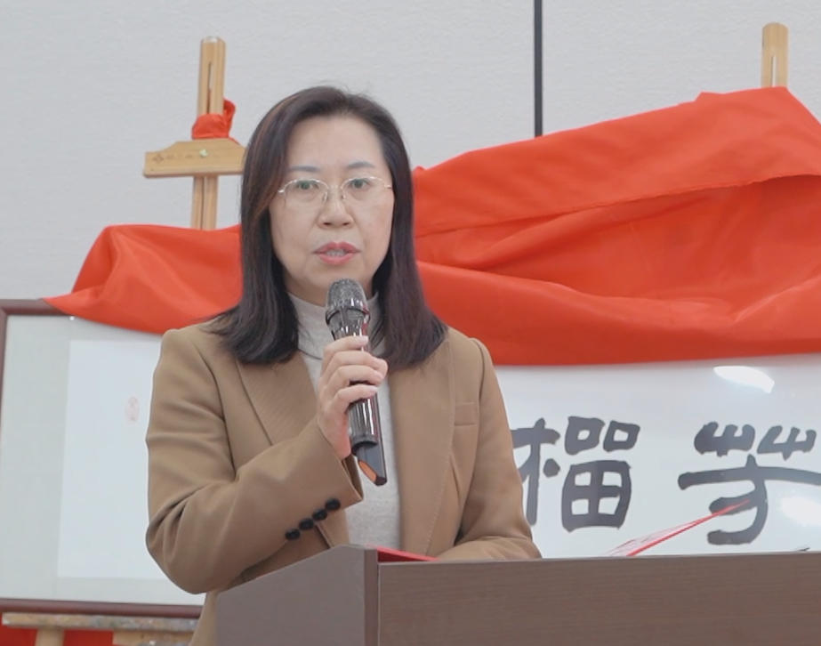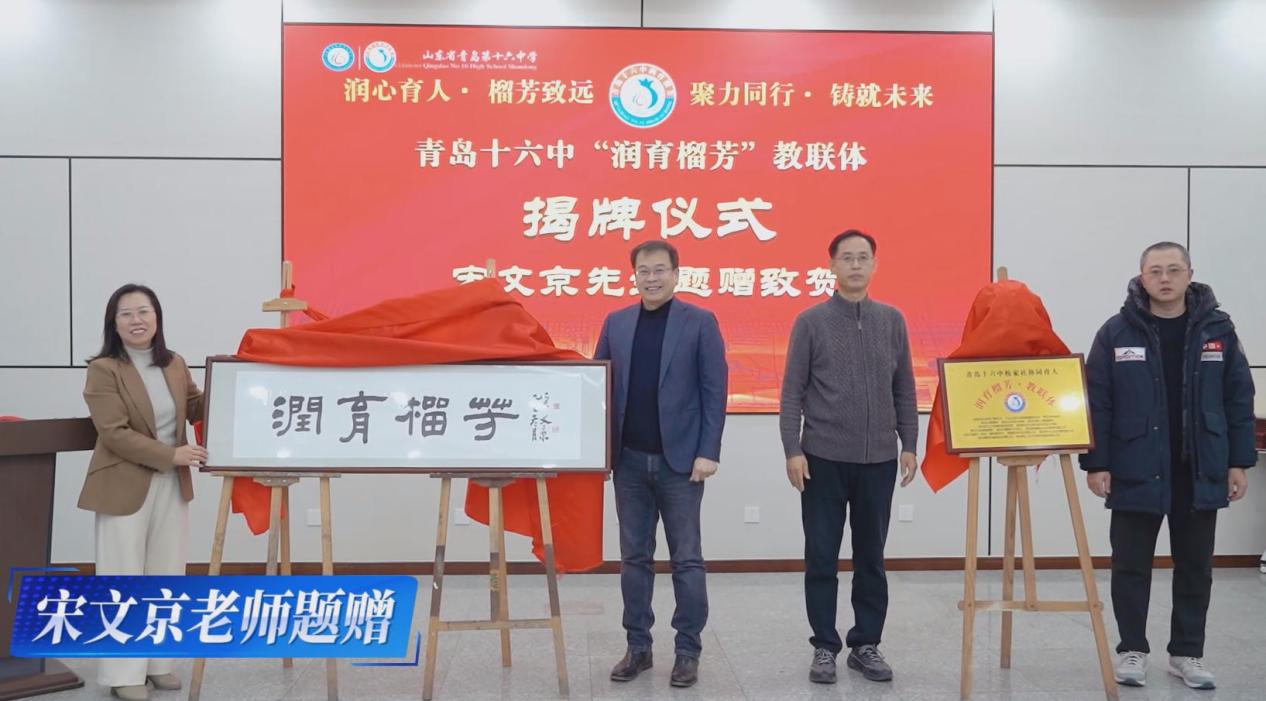 在揭牌仪式环节,青岛十六中张瑞玲书记与嘉宾代表共同为教联体揭牌,随着红色幕布缓缓落下,两块牌匾熠熠生辉——一块是“润育榴芳”教联体铜牌,标志着协同育人组织架构正式确立;另一块是岛城书法名家、青岛市书法家协会副主席宋文京先生特意为教联体题赠的“润育榴芳”四字书法牌匾,笔墨间尽显文化底蕴,成为协同育人理念的生动载体,为教联体注入深厚文化内涵。