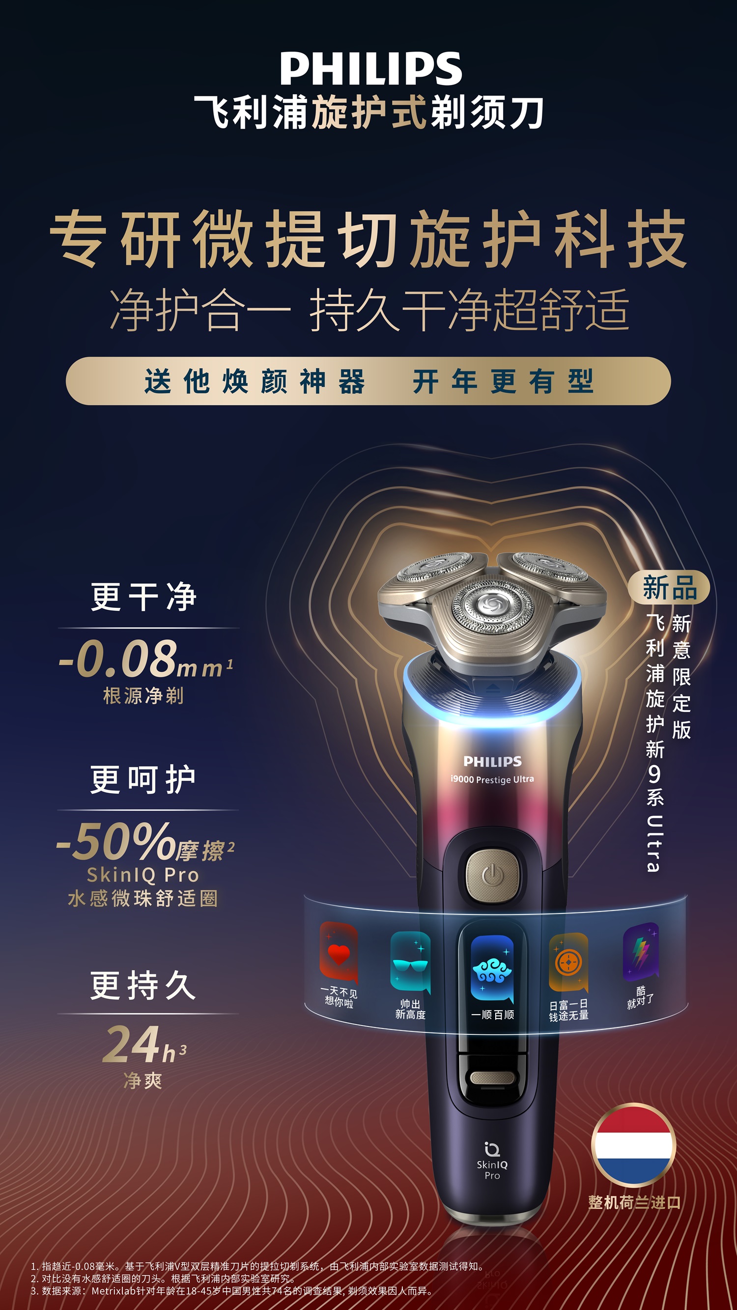 飞利浦旋护新9系 Ultra 新意限定版能精准兼顾 “心意礼赠” 与 “理容刚需” ,背后的每一项功能设计,都能满足当下精英男性高效净剃不留胡茬、全天候清爽等高阶需求。其双层刀片可实现无感微提切,动刀提起胡须、静刀切割胡须,飞利浦专研的微提切技术可实现-0.08毫米根源净剃,告别反复推拉式剃须,有效延缓胡须冒头,避免胡青胡渣,不扎不刺,一次剃须可享受长达24小时的持久清爽;配置SkinIQ Pro压力&动态双重感应技术,并通过4色光环提示剃须力度与动作,贴心引导净剃。
