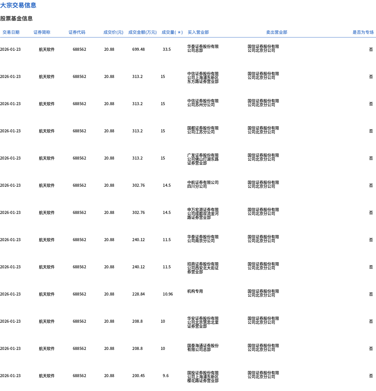1月23日,航天软件大宗交易成交186.06万股,成交额3884.93万元,占当日总成交额的5.68%,成交价20.88元,较市场收盘价24.73元折价15.57%。