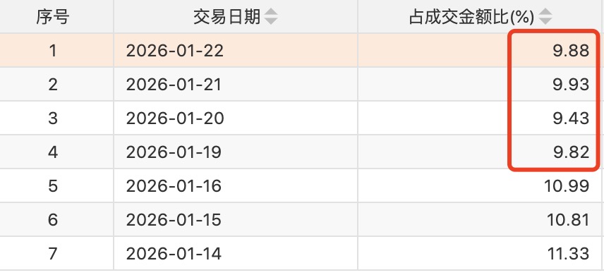两融余额在近两个交易日虽然绝对值有升势,但两融交易在全市场成交中的占比持续走低。据界面新闻统计,1月19日以来,两融交易额占A股成交额的比例维持在10%以下,是2026年以来首次低于10%。1月22日,上述指标仍维持在9.88%。