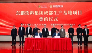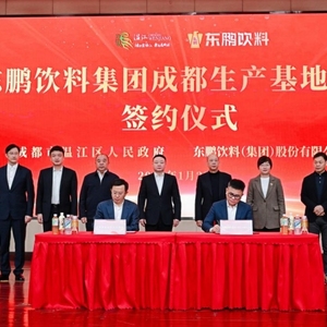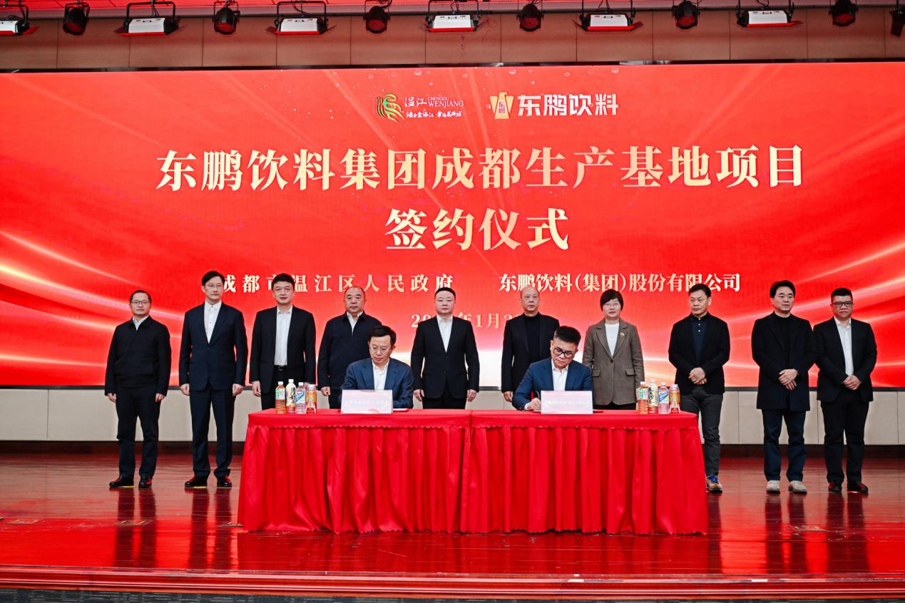 1月23日,东鹏饮料集团成都生产基地项目签约仪式在成都市温江区举行。成都市温江区委副书记、区长王军,东鹏饮料集团董事长、总裁林木勤分别代表双方签署协议。成都市副市长许兴国、东鹏饮料集团副总裁林泽树、省经济合作局二级巡视员张树华、成都市温江区委书记马烈红等出席并见证签约。