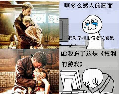 具体表现为:我们的Ned老爹啊就这么被砍头了?劳勃国王被野猪捅死了?卓戈·卡奥就这么被龙母弄死了?我生命的月亮啊……