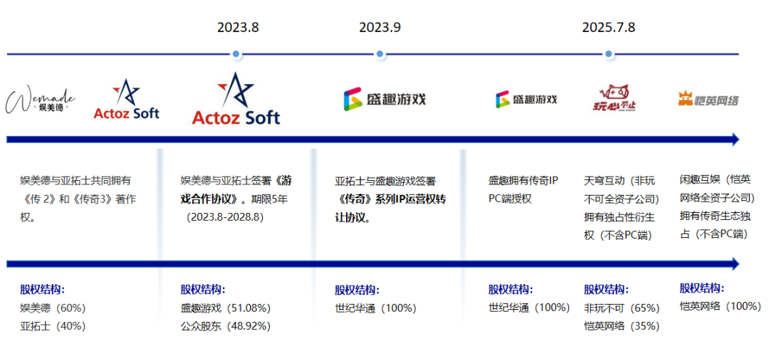 IP版权方(如盛趣游戏、亚拓士、娱美德等)居于核心地位,通过授权费与分成模式实现收益。目前国内传奇IP版权问题已经基本解决,具体如下:2023年8月,亚拓士与韩国娱美德签署了为期5年的《游戏合作协议》,协议明确了《传奇》游戏IP在中国大陆的权利归属,而盛趣游戏通过亚拓士继续保持对《传奇》系列IP在中国大陆的独占运营权;2025年7月8日,盛趣游戏正式与杭州天穹互动网络科技有限公司(玩心不止全资子公司)达成《传奇》及《传奇世界》IP授权合作协议;同日天穹互动再与浙江闲趣互娱(恺英网络全资子公司)签署授权协议,授权其独家开发、运营、推广传奇盒子产品。