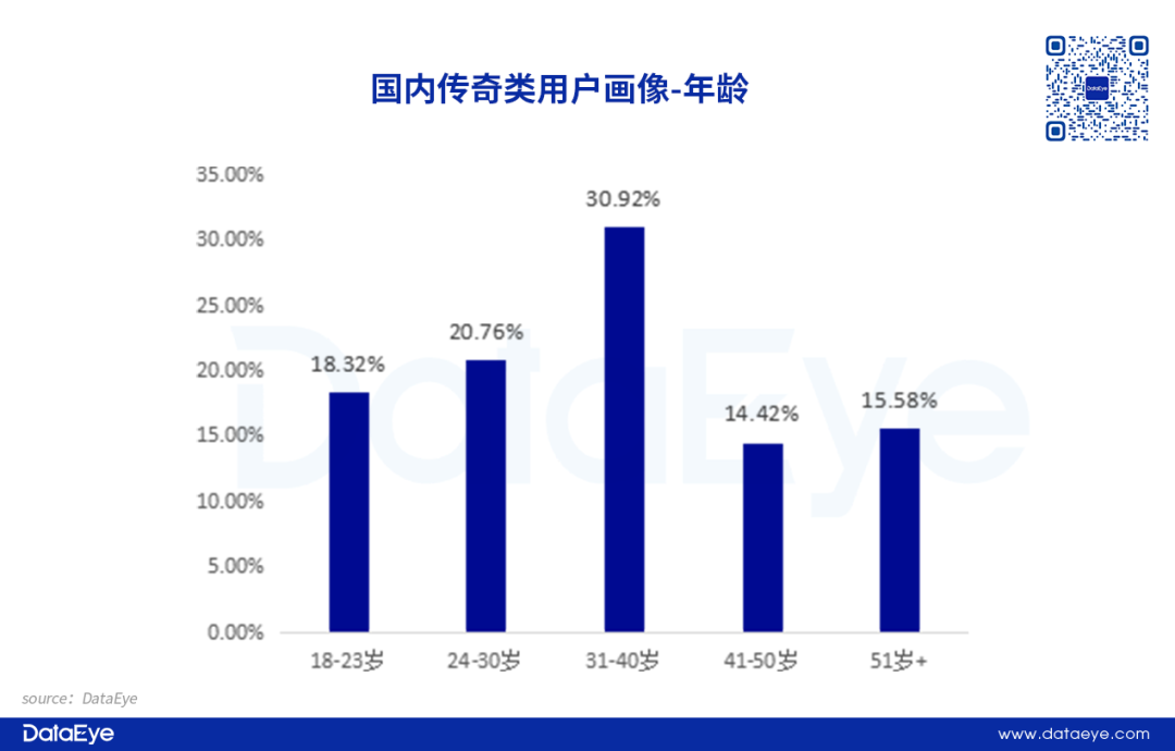 传奇类游戏的用户年龄分布呈现出以中青年为核心、覆盖全年龄段的鲜明特征,31-40岁群体以30.92%的占比成为绝对核心用户,30岁以下的年轻用户合计占比近四成,而41岁以上的中老年群体总占比超30%,这说明传奇类游戏整体形成了独特的“全龄化”用户生态。