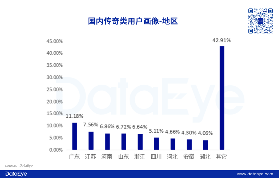 传奇类游戏用户地域分布呈现出人口大省主导、南北市场兼顾、区域付费差异显著的特点。从用户占比来看,广东省以11.18% 的份额位居榜首,江苏、河南、浙江、山东四省占比均超 6%,这五个人口与经济大省合计贡献了近40%的用户总量,反映出传奇游戏的用户基数与地区人口规模、互联网普及率高度相关。因为人口大省用户基数庞大,玩家社交需求旺盛,行会、攻城等强社交玩法的传播与落地更具优势,能够快速形成稳定的游戏社群。
