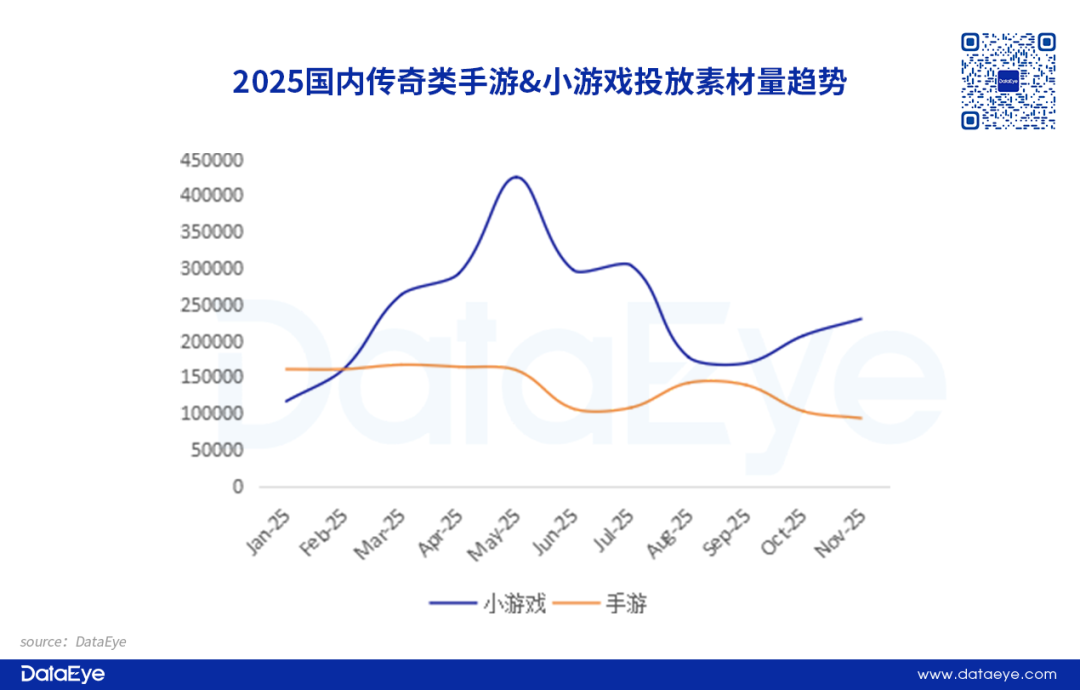 通过对传奇类游戏的投放趋势进行观察,传奇题材的投放素材格局在2025年发生较大的变化。传奇类手游买量素材量在2025年整体维持平稳,但总体投放素材量呈断崖式下滑,这反映出传奇类手游市场趋向饱和,获客难度加剧,相对来说,小游戏赛道已经成为传奇类游戏的抢量新战场,进而导致传奇小游戏投放量激增,基本上主导了传奇类游戏投放素材的整体格局。