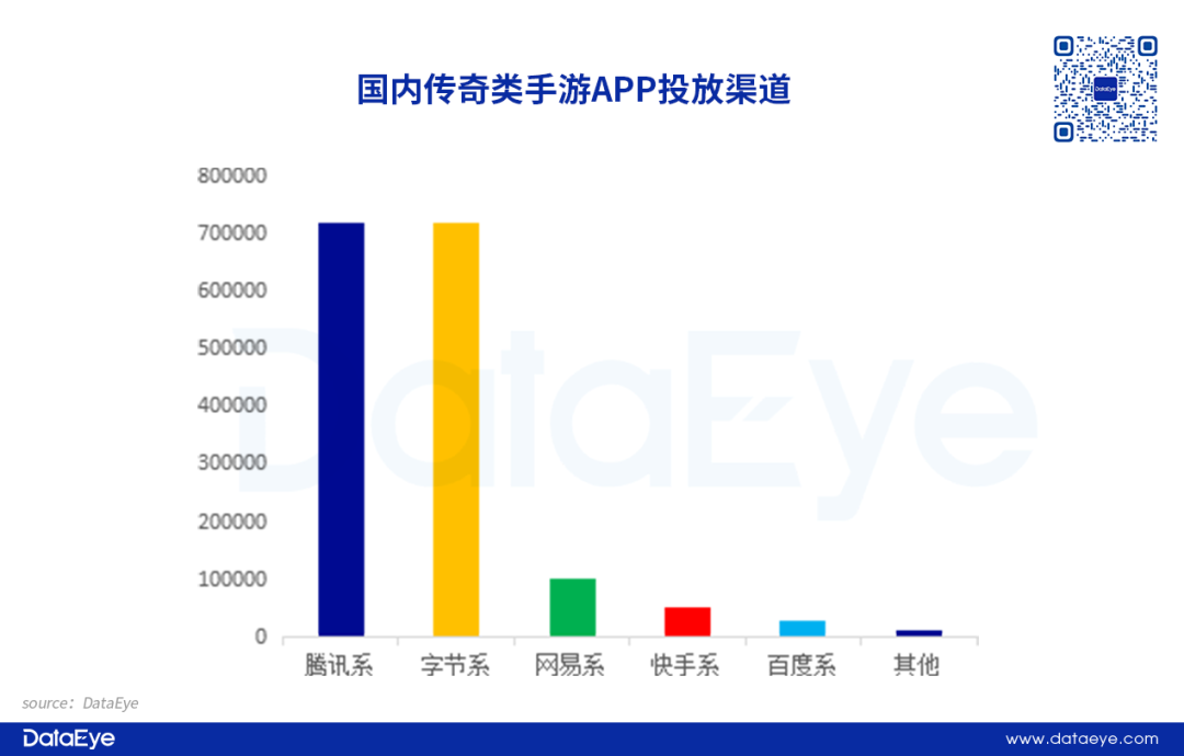 DataEye研究院统计,传奇类手游2025年投放渠道中,高度集中于腾讯系与字节系两大渠道,二者投放量基本持平,形成双雄争霸格局,共同主导传奇游戏买量市场。头部渠道与传奇游戏 30-39 岁男性核心用户高度匹配,且具备政策激励(如腾讯高分成)、场景适配(如字节直播带玩)等优势,转化效率突出。