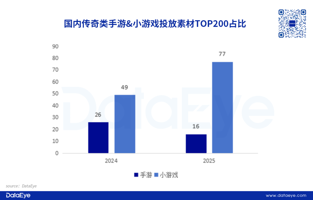 近两年,传奇题材投放数据的反向变动。2024年手游总投放素材榜TOP200产品中,传奇类手游有26款,而2025年则下降至16款。对比来看,2024—2025年小游戏总投放素材榜TOP200产品中,传奇类小游戏从49款升至77款。这种反差本质是传奇核心用户需求与赛道特性的深度匹配结果。