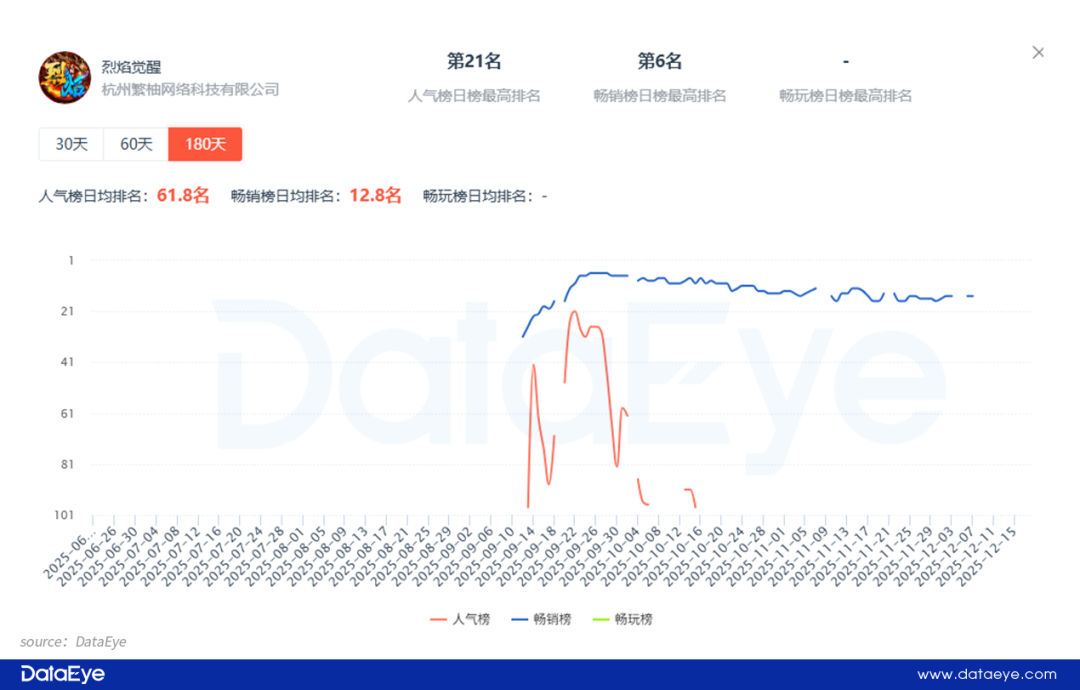 玩心不止的传奇小游戏《烈焰觉醒》在2025年9月11日正式发布,次日冲入微信小游戏畅销榜,并排名第31名。随后《烈焰觉醒》市场表现持续突出,上线不足一个月就冲入微信小游戏畅销榜TOP10,并排名第6。