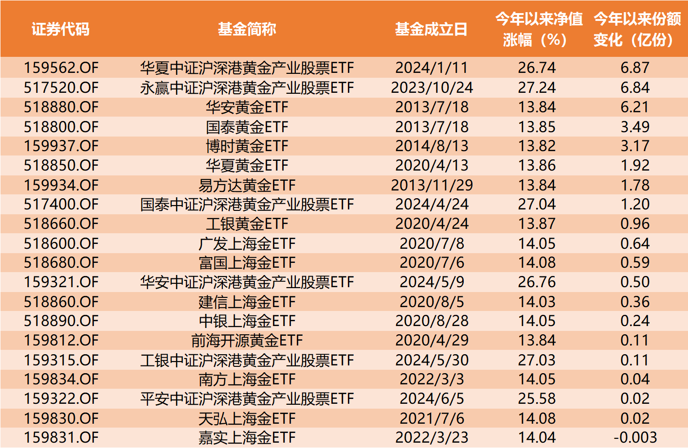 其中华夏沪深港黄金产业股票ETF(159562.OF)、永赢沪深港黄金产业股票ETF(517520.OF)和华安黄金ETF(518880.0F)的份额分别增长了6.87亿份、6.83亿份和6.21亿份;此外,国泰黄金ETF(518800.OF)和黄金ETF华夏(518850.OF)的份额分别增长了3.49亿份和3.16亿份。