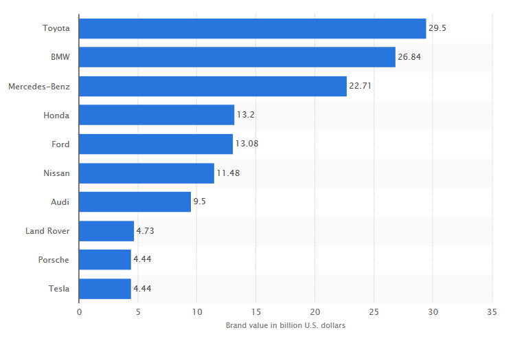 世界汽车品牌价值排行榜(单位:十亿美元;数据来源:Statista)