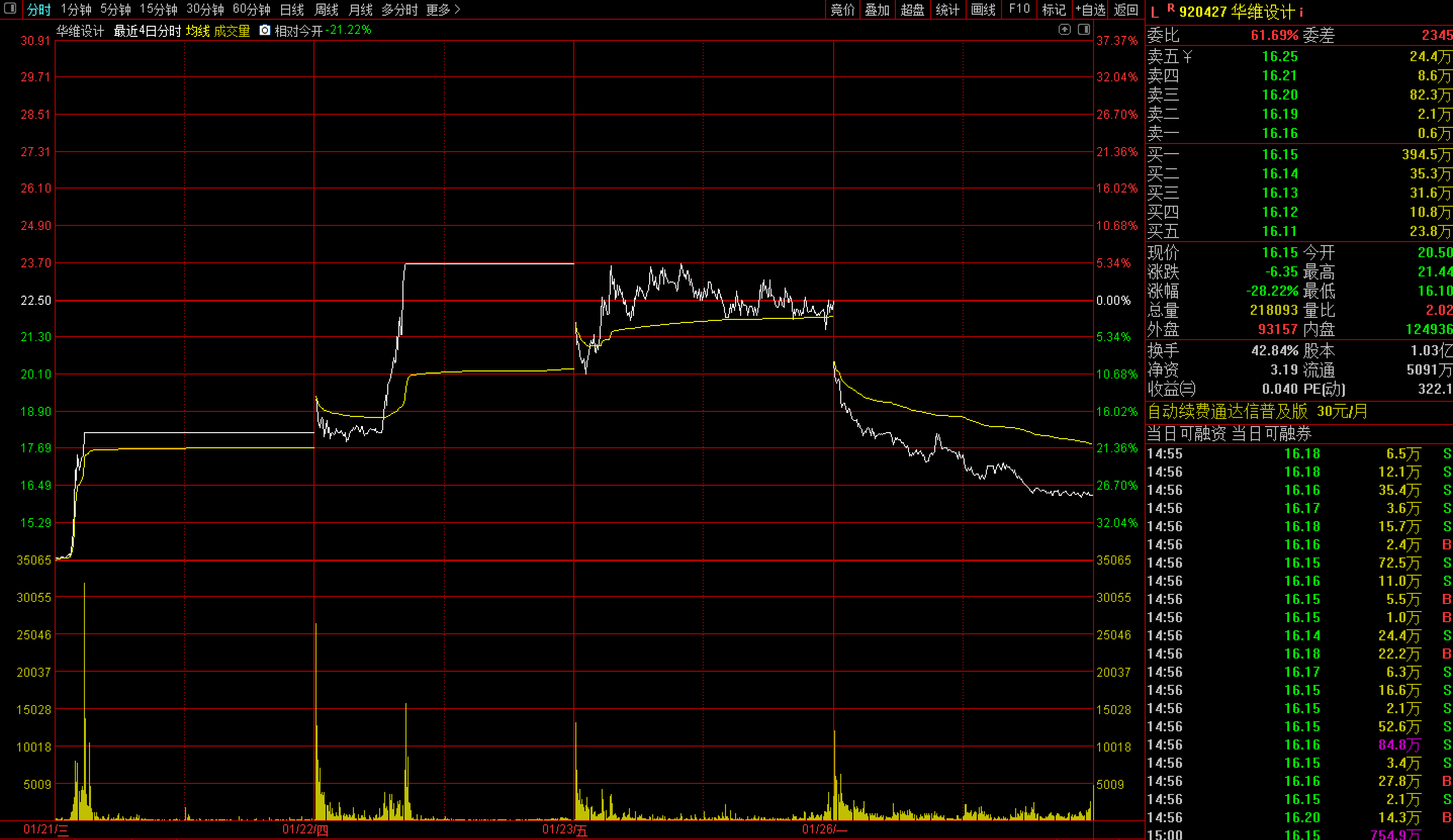 1月26日,华维设计大幅低开,然后股价持续走低,最终收跌28.22%,全天总成交3.88亿元。