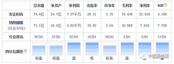 作为国内高端女装品牌JZ玖姿的母公司安正时尚,目前总市值74.4亿,行业排名居26位;净利润7.07千万,位于行业第22位;净利率为22.91%,跻身行业第4名,高于行业平均值。