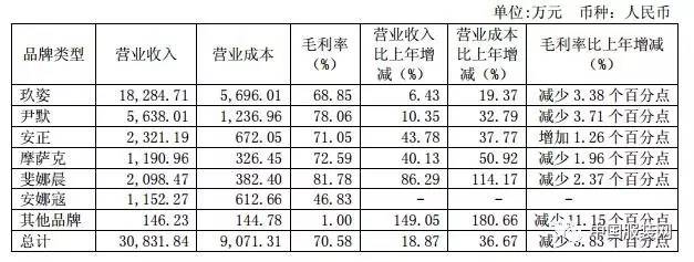 安正时尚2017一季度营业收入为3.08亿元,同比上年增长18.89%;净利润为7067.2万元,同比上年增长16.5%。而主要营收玖姿品牌营业收入为1.8亿元,同比上年增长6.43%;毛利率为68.85%,同比上年却减少了3.38个百分点。