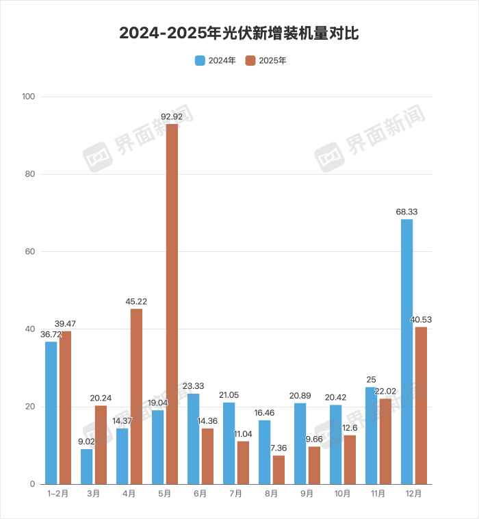 但下半年的“冲劲”明显不足,6月起单月装机均逊于2024年。即使在年末12月装机旺季,国内新增光伏装机数据不过约0.4亿千瓦,同比下跌超40%。