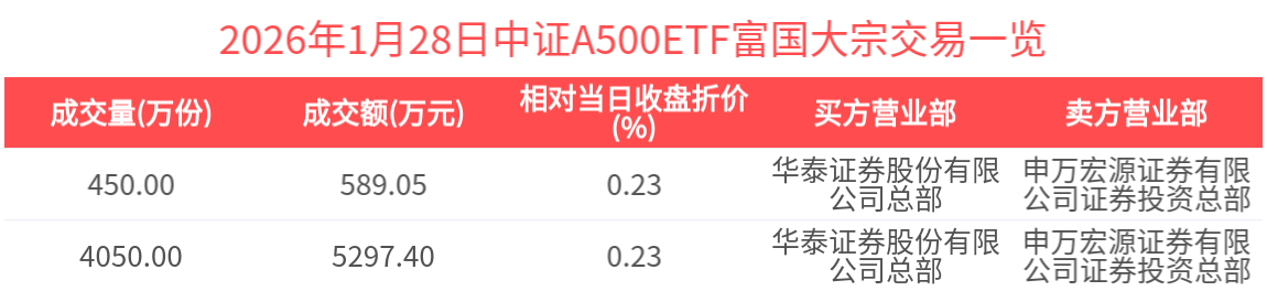 2026年1月28日,中证A500ETF富国(563220.SH)收涨0.84%,发生2笔折价大宗交易,成交价均为1.31元,较当日收盘价折价0.23%。成交额分别为589.05万元,5297.40万元,总成交额为5886.45万元,居可比基金首位。(数据来源:Wind)