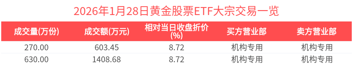 2026年1月28日,黄金股票ETF(517400.SH)收涨10.00%,发生2笔折价大宗交易,成交价均为2.24元,较当日收盘价折价8.72%。成交额分别为603.45万元,1408.68万元,总成交额为2012.13万元,居可比基金首位。(数据来源:Wind)