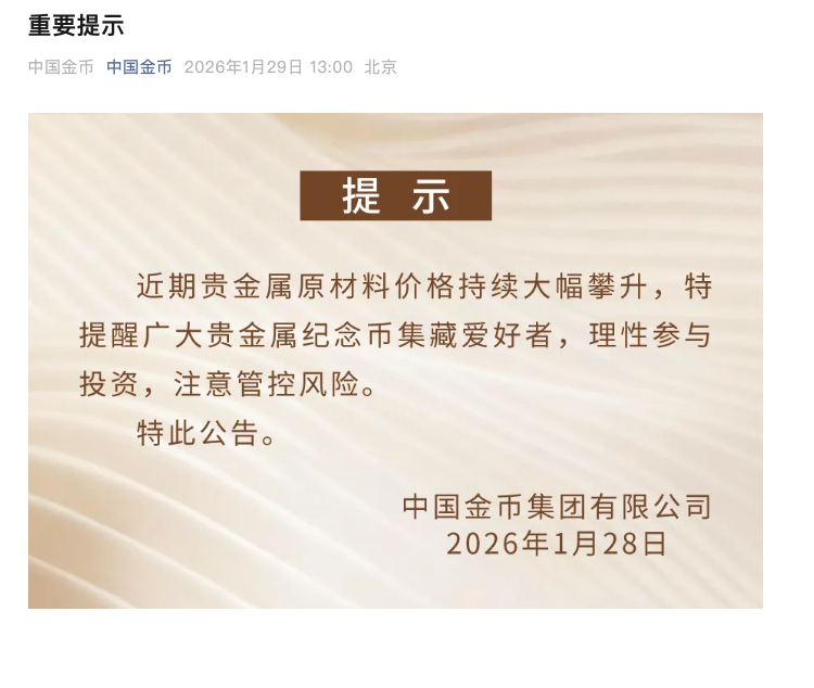 1月29日消息,中国金币集团有限公司发布提示:近期贵金属原材料价格持续大幅攀升,特提醒广大贵金属纪念币集藏爱好者,理性参与投资,注意管控风险。