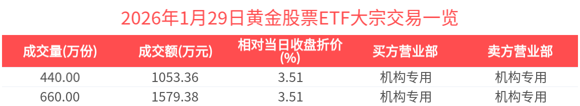 2026年1月29日,黄金股票ETF(517400.SH)收涨0.94%,发生2笔折价大宗交易,成交价均为2.39元,较当日收盘价折价3.51%。成交额分别为1053.36万元,1579.38万元,总成交额为2632.74万元,居可比基金第一。(数据来源:Wind)