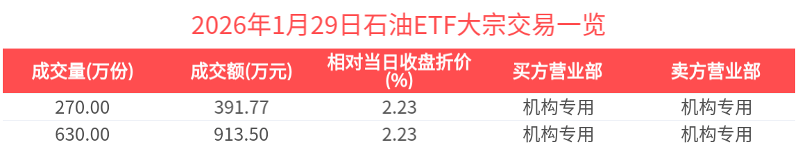 2026年1月29日,石油ETF(561360.SH)收涨1.23%,发生2笔折价大宗交易,成交价均为1.45元,较当日收盘价折价2.23%。成交额分别为391.77万元,913.50万元,总成交额为1305.27万元,居可比基金第一。(数据来源:Wind)