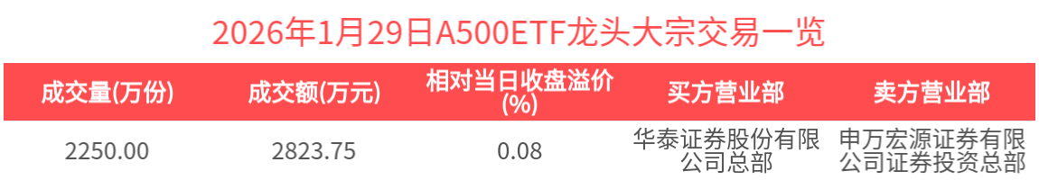 2026年1月29日,A500ETF龙头(563800.SH)收涨0.48%,发生1笔溢价大宗交易,成交价为1.26元,较当日收盘价溢价0.08%。成交额为2823.75万元,居全市场首位。(数据来源:Wind)