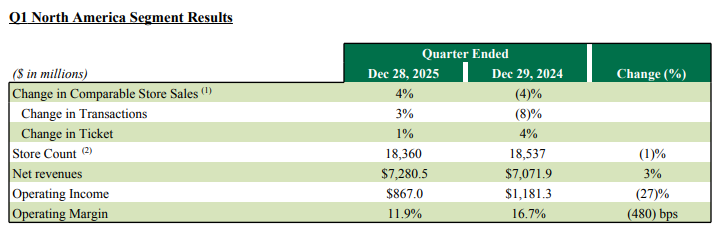 2026财年第一季度(2025年10-12月),营业收入增长5%至99亿美元,同店销售额同比增长4%。全球新增了128家咖啡馆,营业利润率为10.1%。