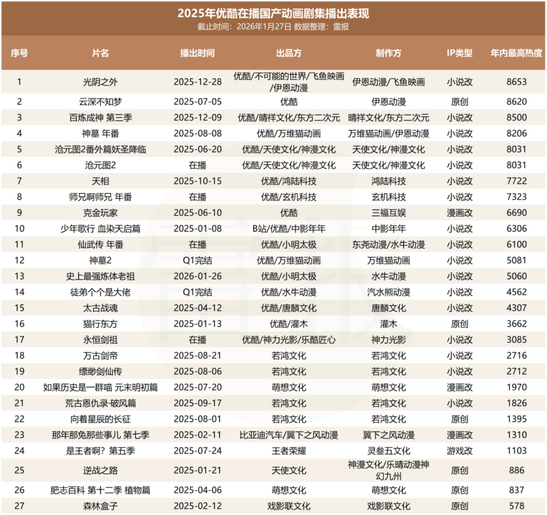 过去一年,优酷在国产动画领域持续布局,展现出鲜明的发力态势。2025年以来,平台共上线27部国产动画作品,并参与出品了其中17部。