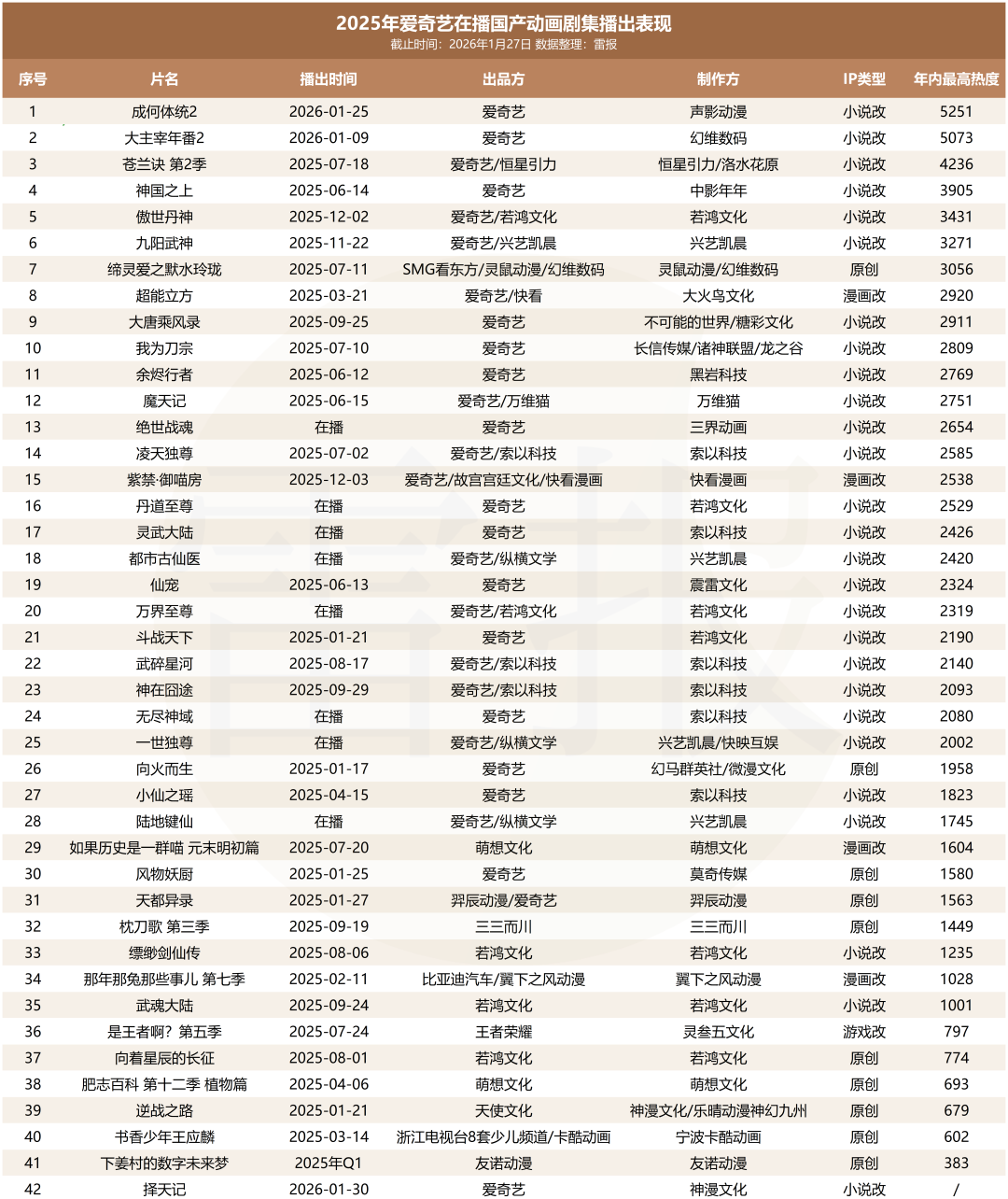 2025年至今,爱奇艺共播出国产动画42部,其中平台参与出品30部。从热度表现看,作品反响存在一定分化:一方面,“长番剧”凭借爆款单品集中引爆热度;另一方面,16部“短文化”类作品则构成了平台内容的中坚力量。
