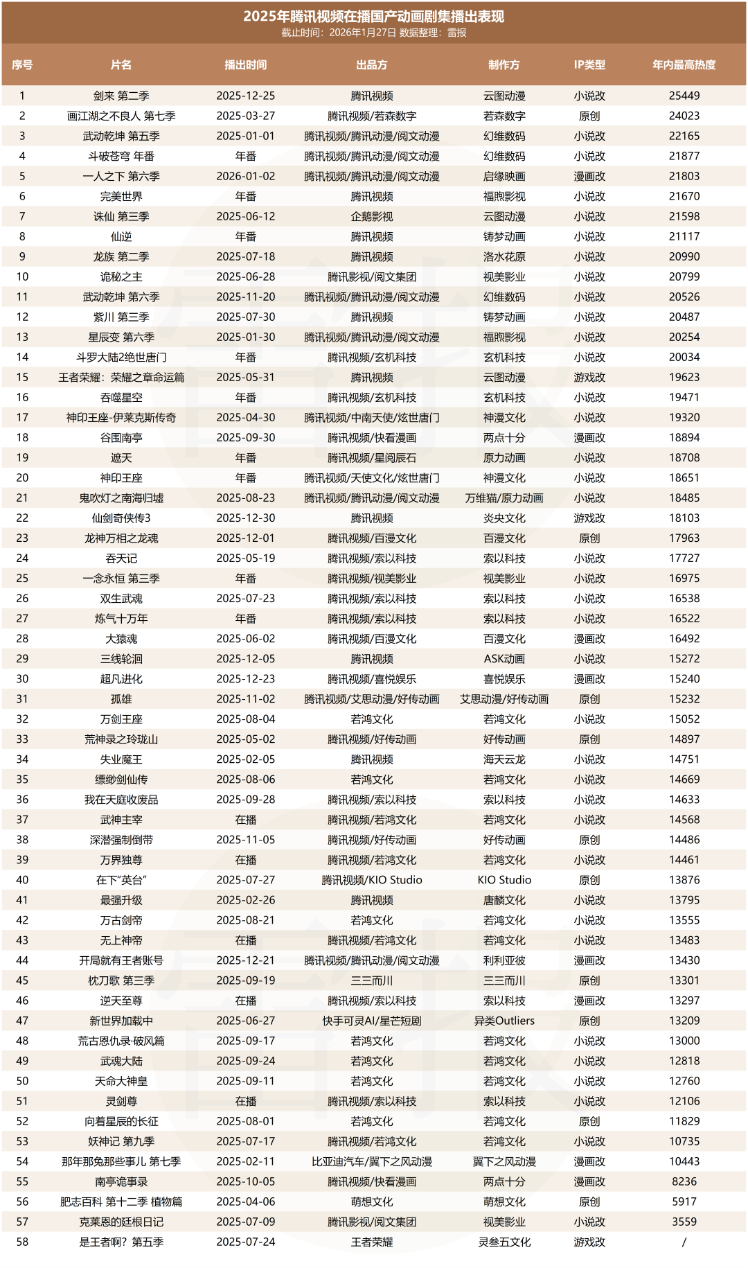 具体而言,于2025年12月末上线的《剑来 第二季》以突破25000的热度成为年度榜首;2026年1月开播的《一人之下 第六季》则以21803的热度位列第五。