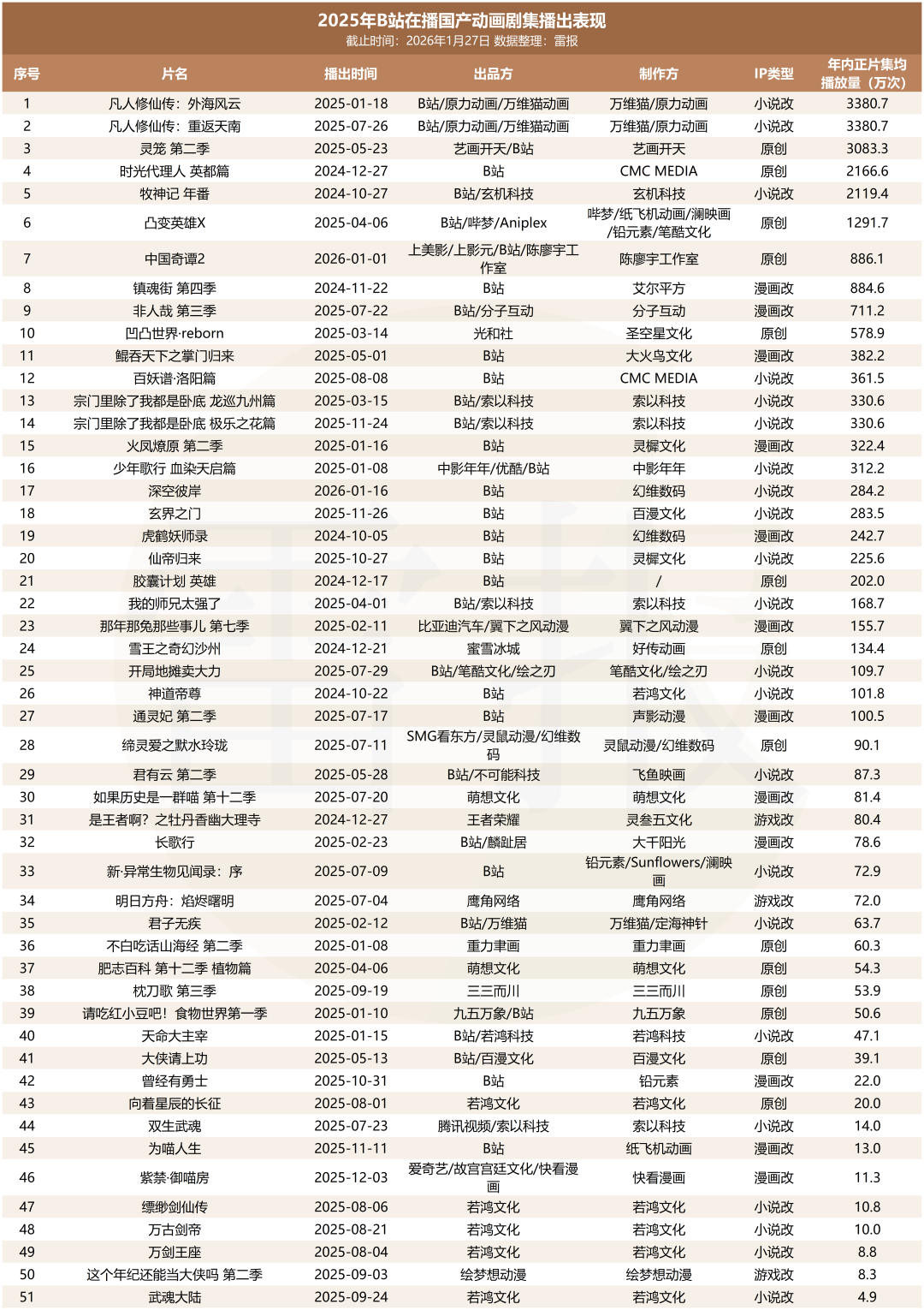 2025年至今,B站共上线国产动画作品51部,平台参与出品其中的33部,持续巩固其在国创内容领域的布局。