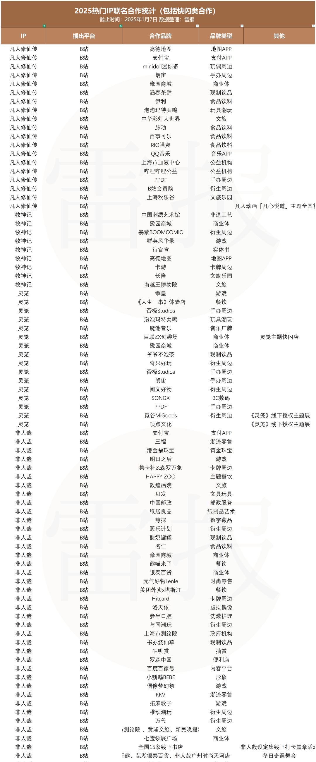商业化方面,B站展现出独特的生态赋能效应。全年七大头部IP共计达成155项品牌联名,不论数量还是合作密度,均显著高于其他平台,形成了一套基于B站二次元社群生态的立体化IP开发路径。