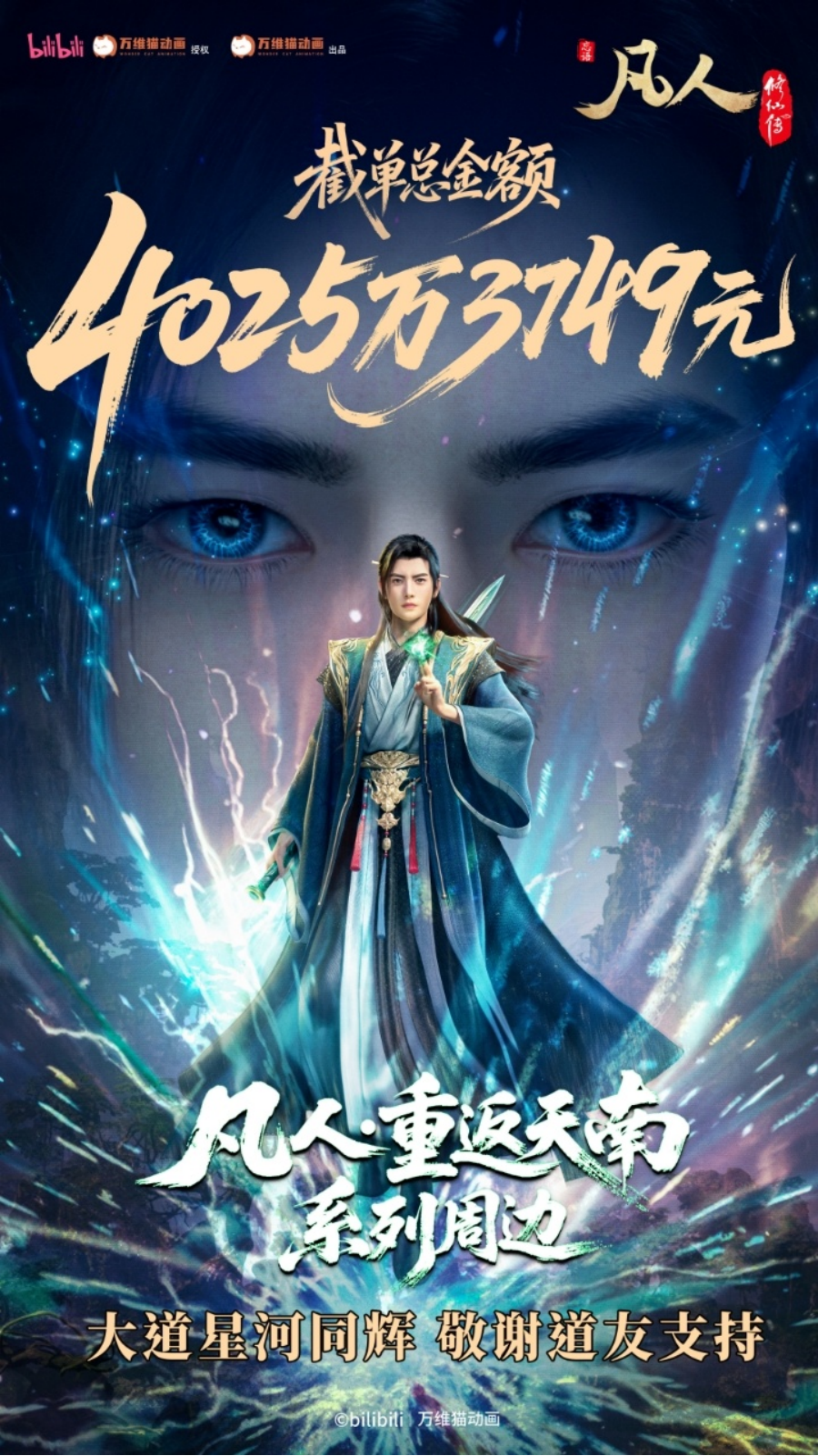 作为B站3D动画的标杆之作,《凡人修仙传》在商业化上屡创纪录。2025年,其“重返天南”系列周边在会员购平台发起众筹,最终揽获4025万元,刷新国产动画衍生品众筹纪录。更引发热议的是,动画将8万名支持者ID列入片尾致谢,这一创举巧妙地将消费行为转化为具有仪式感的情感共鸣,深化了用户与IP之间的情感连接。
