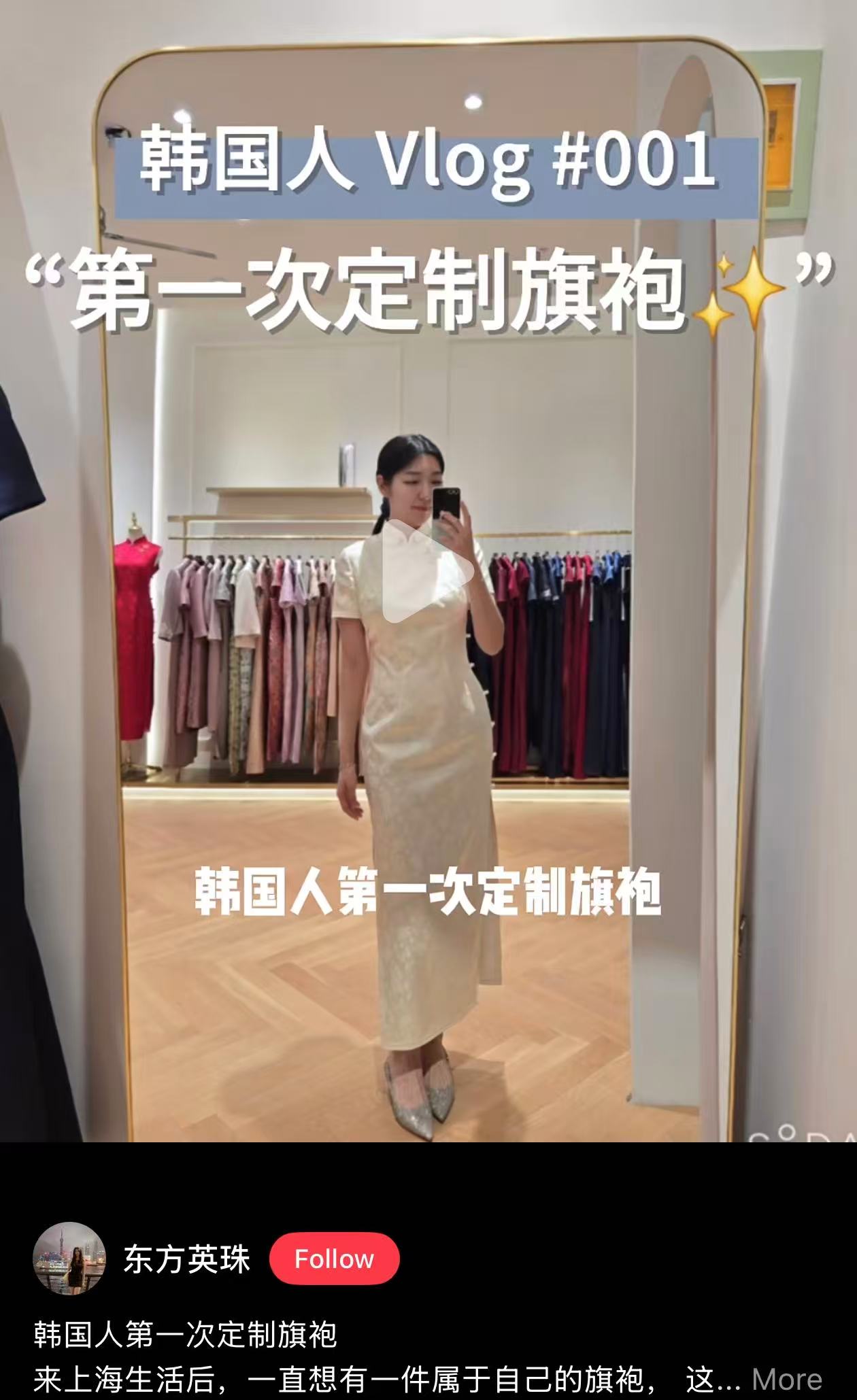 她把这一刻记录了下来。在自己的小红书账号“东方英珠”上,她分享了收到成品、试穿完成品的 vlog。镜头并不复杂,更多是站在镜子前的确认与欣喜,没有修改、没有反复调整,这件衣服第一次穿上身,便完成了它与穿着者之间的匹配。