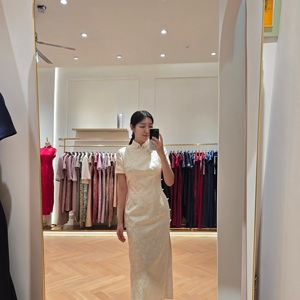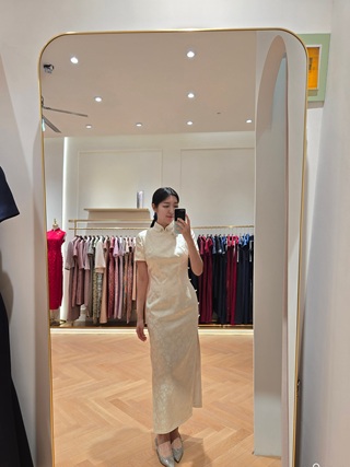 两周后成品完成,她第一次穿上这件旗袍时,最直观的感受并不是惊艳,而是一种确定的轻快感——衣服并没有夺走她的存在感,却让她清楚地意识到,这是为她而存在的一件衣服。
