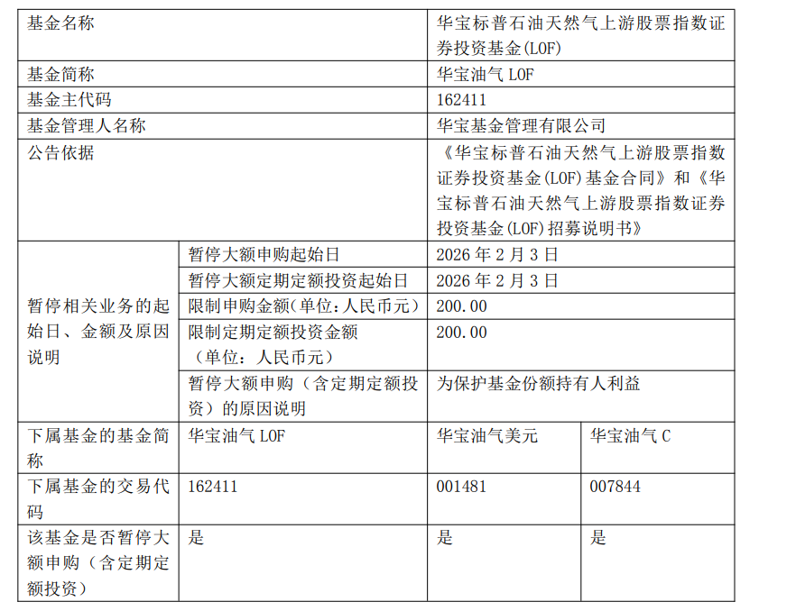 华宝油气LOF1月30日公告,自2月3日起暂停大额申购及大额定期定额投资业务,每日累计投资限额降至200元。