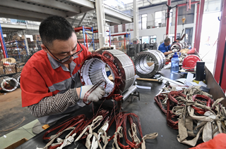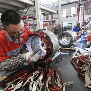 2025年8月31日,山东潍坊,青州市一家发电机制造企业的工人在车间内组装生产。图片来源:CFP