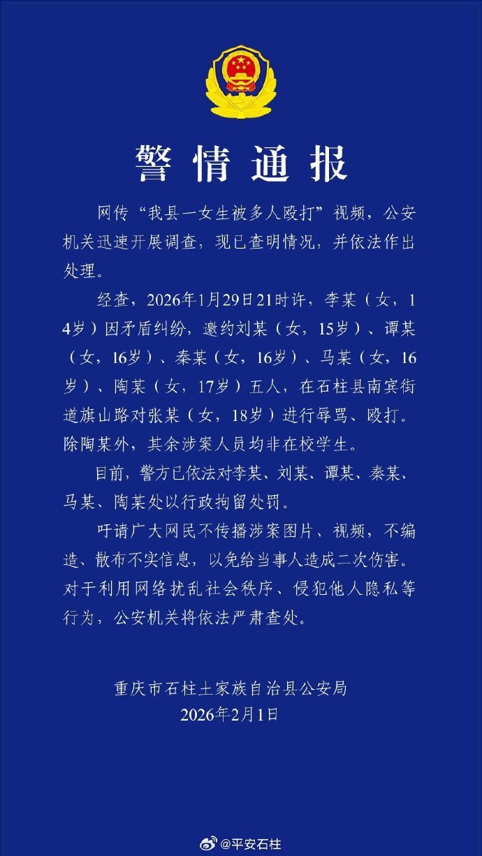 石柱土家族自治县公安局2月1日通报,经查,1月29日21时许,李某(女,14岁)因矛盾纠纷,邀约刘某(女,15岁)、谭某(女,16岁)、秦某(女,16岁)、马某(女,16岁)、陶某(女,17岁 )五人,在石柱县南宾街道旗山路对张某(女,18岁 ) 进行辱骂、殴打。除陶某外,其余涉案人员均非在校学生。目前,警方已依法对李某、刘某、谭某、秦某、马某、陶某处以行政拘留处罚。