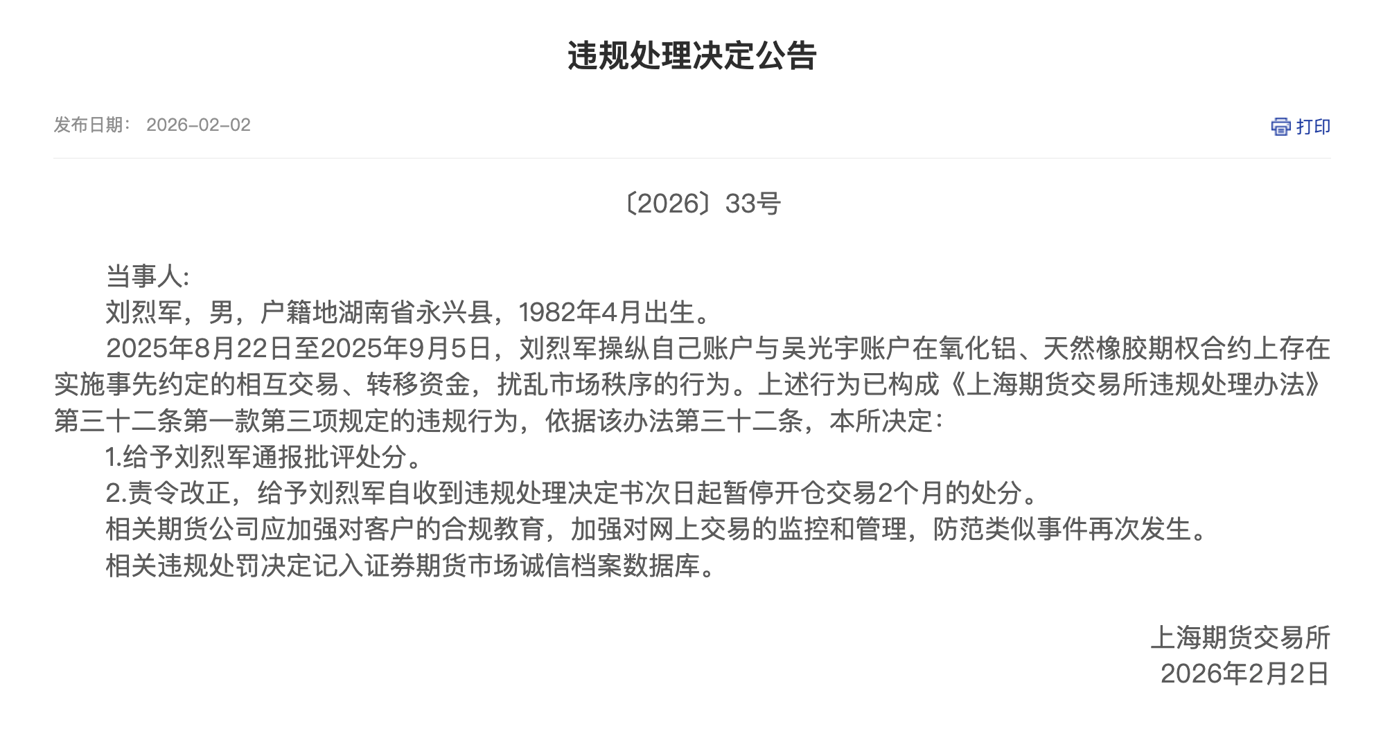 同日,另一则违规处理决定公告显示,2025年8月22日至2025年9月5日,刘烈军操纵自己账户与吴光宇账户在氧化铝、天然橡胶期权合约上存在实施事先约定的相互交易、转移资金,扰乱市场秩序的行为。上海期货交易所决定给予刘烈军通报批评处分,责令改正,并给予刘烈军自收到违规处理决定书次日起暂停开仓交易2个月的处分。