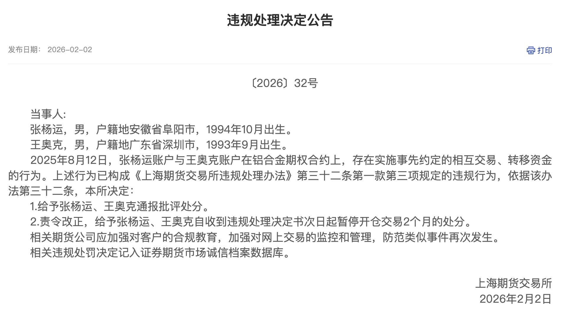 2月2日,上海期货交易所发布违规处理决定公告。公告指出,2025年8月12日,张杨运账户与王奥克账户在铝合金期权合约上,存在实施事先约定的相互交易、转移资金的行为。上海期货交易所决定给予张杨运、王奥克通报批评处分;责令改正,给予张杨运、王奥克自收到违规处理决定书次日起暂停开仓交易2个月的处分。